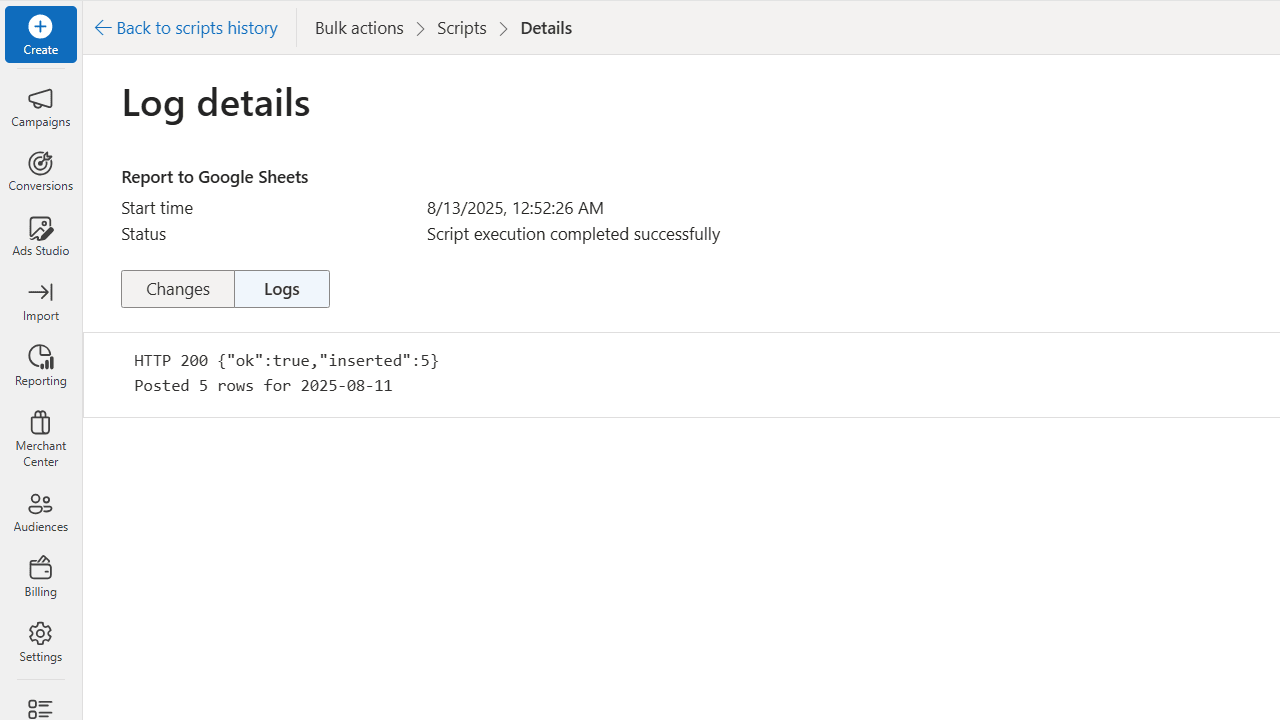 - In Microsoft Ads, open Tools > Scripts, create a new script, and paste the code as described in Step 3.