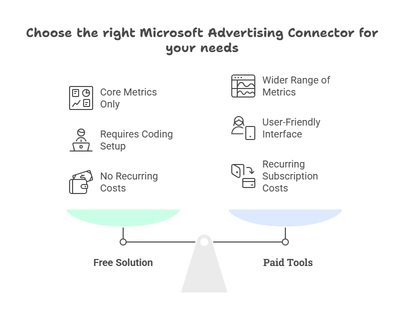 When deciding between a free, custom-built Microsoft Ads connector like the one in this guide and a paid tool, there are a few key differences to consider.