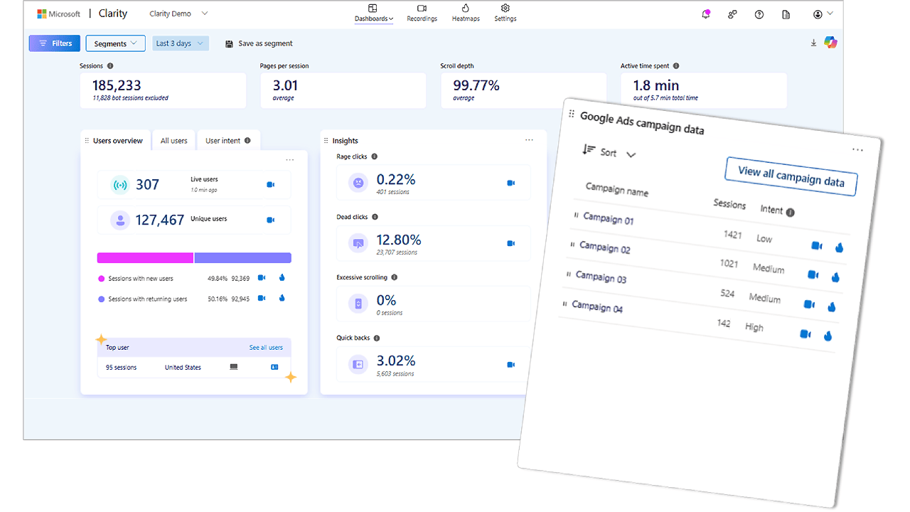 - Filter Clarity dashboards by Google Ads campaigns.