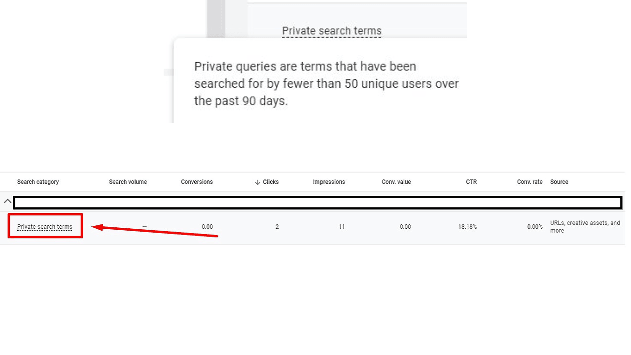 Adriaan Dekker received an update from Arpan Banerjee on a new Private Search Terms category that has surfaced in Performance Max campaigns, grouping sensitive or less identifiable search terms.