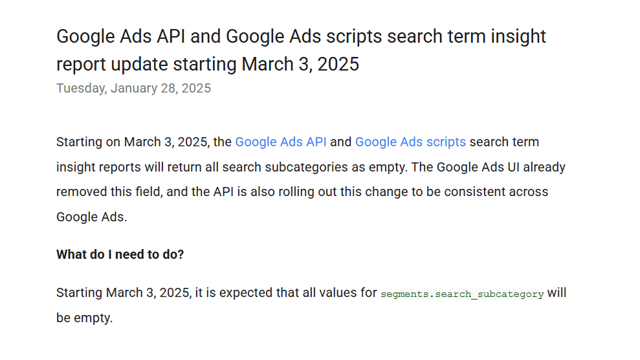 Starting March 3, 2025, Google Ads API and Google Ads Scripts will no longer provide search subcategories in search term insight reports.