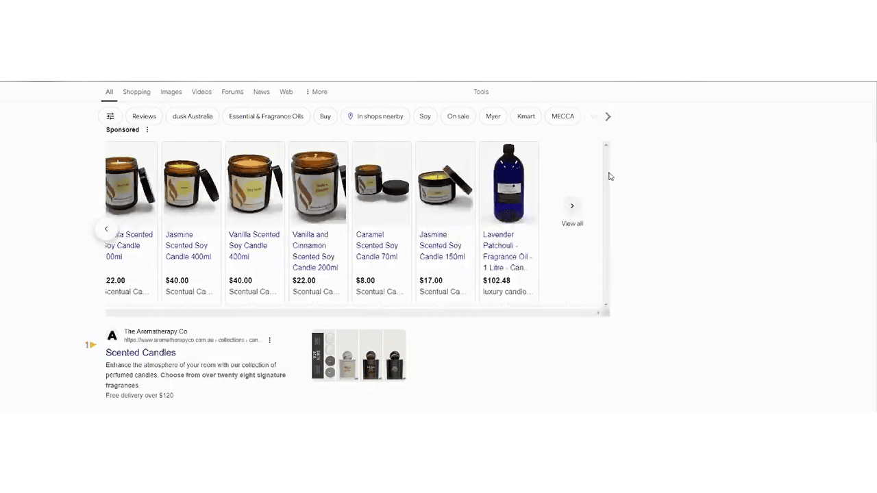 Screenshot of a Google search results page featuring various scented candle products. Images and prices for fragrances like Vanilla and Apple Spice are highlighted, set in a sleek horizontal scroll that showcases an amber glass bottle labeled Lavender Essential Oil Fragrance.