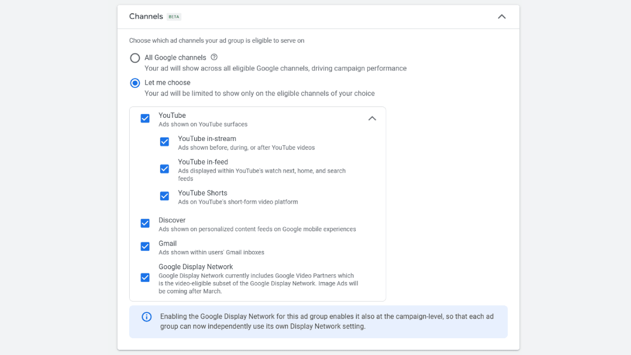 Channel controls were announced in January 2025 and give advertisers the ability to choose which networks their ads appear on.