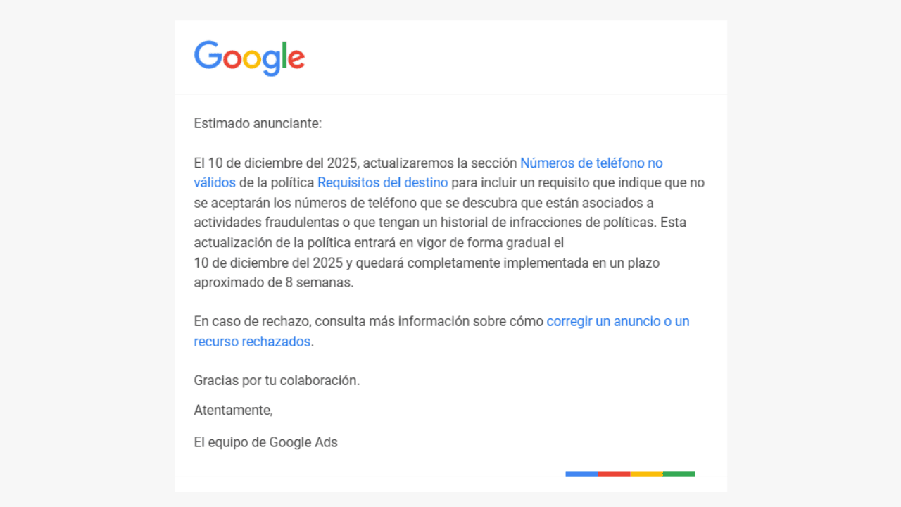 A Google Ads email in Spanish informs advertisers about a December 2025 policy update: fraud-linked phone numbers will be banned. The message details the changes, implementation timeline, and offers a link for help with rejected ads.
