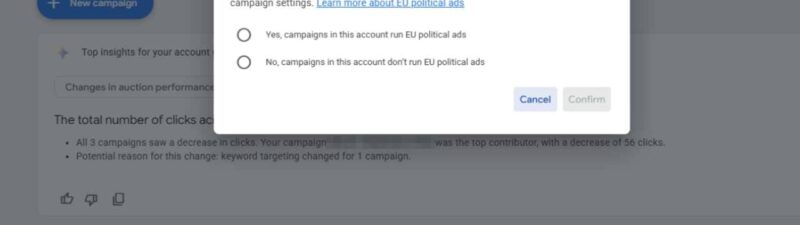 Google Ads is now showing a popup asking advertisers to confirm whether their account runs European Union political ads.