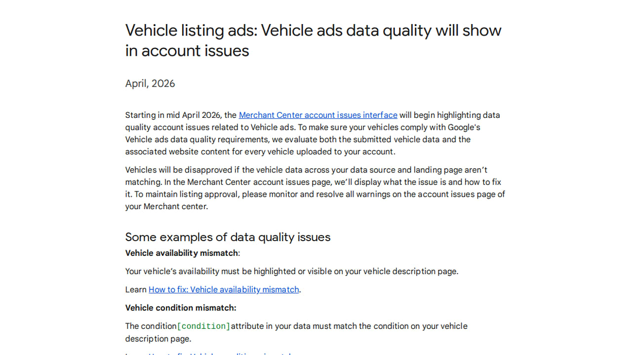Starting in mid April 2026, Google Merchant Center will begin highlighting data quality issues specifically for Vehicle ads within the account issues interface.
